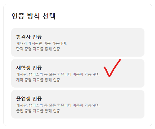 재학 중이라서 [재학생 인증] 선택